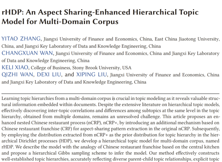 ​近期,计算机与人工智能学院万常选教授投稿的“rHDP: An Aspect Sharing-Enhanced Hierarchical Topic Model for Multi-Domain Corpus”论文ACM Transactions on Information Systems(TOIS)收录刊登,是我校在数据挖掘领域取得的又一重大进展。