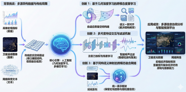 在财经大数据分析中,数据高度多源异构的特征日益显著,涵盖高维数值型宏观指标、卫星遥感图像、网络舆情文本等多种形态。传统分析方法通常依赖于欧氏空间假设,难以捕捉不同模态数据内在的几何结构与拓扑关系,导致信息融合效率低、噪声干扰大。人工智能技术,特别是多模态学习与几何深度学习,为突破这一瓶颈提供了新的方法论支撑,能够从数据本身的流形结构出发,实现跨模态语义对齐与稳健特征融合。为此,中心以流形学习与多模态表示学习为核心,引入多尺度特征交互与注意力机制,构建了一套面向异构数据的智能融合与分析框架(如图1.3所示)。该框架不依赖于统一的欧氏空间假设,而是通过几何感知的嵌入映射,将不同模态数据投影到共享的语义空间中,从而保持各模态内在的结构信息,并增强对噪声与局部形变的鲁棒性,最终形成一套稳健的多源异构数据分析工具箱。主要创新成果如下: