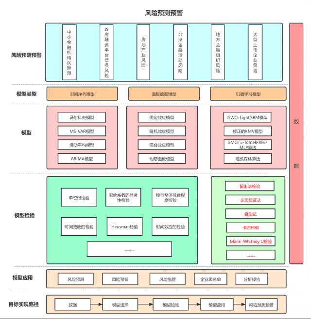 在当今快速变化的技术环境中,企业对于金融活动进行全方位、实时化风险监测和管理的需求尤为迫切。面对数据分散形成的信息孤岛、风险识别能力不足、监管工具滞后以及跨区域风险传导监测困难等挑战,传统的监管手段已难以满足现代金融监管工作的高标准要求。中心以“数据驱动、模型智能”为核心理念,研发了金融风险监测预警技术,围绕六大类重点风险领域(中小金融机构风险、政府融资平台债务风险、房地产行业风险、非法金融活动风险、地方金融组织风险、大型上市企业风险),通过时间序列模型、面板数据模型和机器学习模型三大技术路径进行多维度建模,并辅以科学的模型检验机制与多样化应用场景,最终实现从原始数据到风险决策支持的闭环管理。技术架构图如图1.18所示。