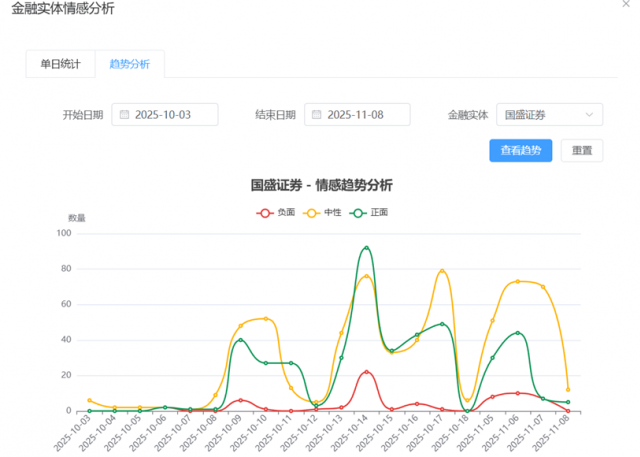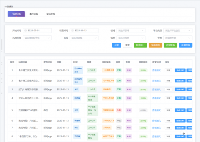 上述技术已用于中心与江西省委金融办合作的《江西省金融风险监测预警平台项目(B包)》中,图1.9展示了基于舆情数据的情感智能分析情况,图1.10为金融实体的情感分析情况。图1.11展示了江西省金融风险监测预警平台界面图。