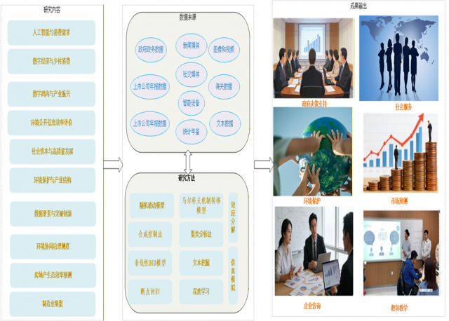 中心围绕“数据驱动的经济预测”主题,构建了“一核三翼”的技术与理论体系,核心理论模型基于动态面板模型、空间杜宾模型、Hamilton优化模型等,涵盖消费、生产、环境、创新等多维度的经济系统仿真模型,突破了多源异构数据融合、政策效应动态识别、机制路径可视化等难题。如图1.15所示,主要技术突破包括: