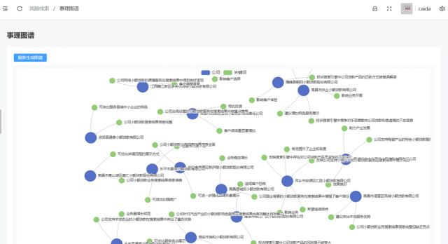 图1.6展示了针对财经评论,利用上述技术构建的事件意义之间语义逻辑图。图1.7展示了上述技术应用于构建江西省金融相关企业与业务描述、运营特征等信息的事理图谱,基于该事理图谱可分析企业的金融风险情况,并进行风险预警,如图1.8所示。上述突破技术已应用于与江西用友软件有限责任公司深度合作的项目中,与江西中至科技有限公司合作的《玩家付费行为分析与收入预测系统》项目。