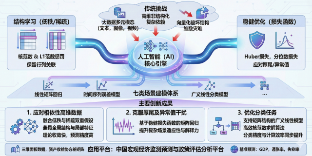 综上,中心以人工智能中的结构学习与稳健优化为核心,系统构建了覆盖线性矩阵回归、时间序列误差模型及广义线性分类模型等七类场景的矩阵型数据建模体系。该体系主要突破体现在:第一,摒弃传统向量化思路,通过低秩约束保留矩阵行列结构,有效缓解高维经济数据中的“维数灾难”;第二,融入稳健损失函数,增强模型对厚尾分布与异常值的适应能力,提升在金融风险与宏观经济波动分析中的稳定性;第三,面向分类预测任务实现结构保持的智能算法,解决分类模型中矩阵信息丢失问题。目前,相关核心算法已集成于“中国宏观经济监测预测与政策评估分析平台”,并成功应用于省份-时间-指标三维面板数据矩阵、资产收益协方差矩阵等高维经济数据中,实现对GDP、通胀率、失业率等关键宏观经济指标的精准智能预测。