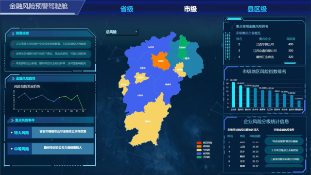 基于以上技术,开发了江西省金融风险监测预警平台。平台界面如图1.19所示。平台能够支持省、市、县三级风险分级输出,通过智能风险识别模型实现对潜在风险的早发现、早预警、早处置,从而将风险控制在萌芽状态。同时,涵盖了微信、微博等119个信息源,每天处理数万条数据,确保了数据的广泛性和及时性。通过对金融相关性分析、细粒度情感分析、实体关系抽取等关键技术的应用,进一步提升了系统的准确性和实用性。平台计算了江西省11市100县(区)的金融风险指数,并结合负面清单因素,绘制了市县两级风险地图以直观展示风险等级,切实提升了金融风险量化评估和监测预警的精准性。该成果已在全省金融风险会商会上汇报,并获得省领导肯定性批示。