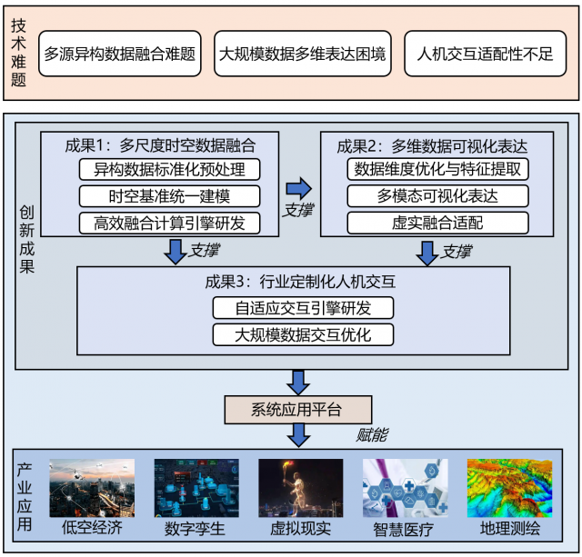 针对上述挑战,构建“融合-表达-交互”三位一体的技术突破体系,由“多尺度时空数据融合技术”“多维数据可视化表达技术”“行业定制化人机交互技术”三项创新成果构成。如图1.13所示,主要的突破技术包括: